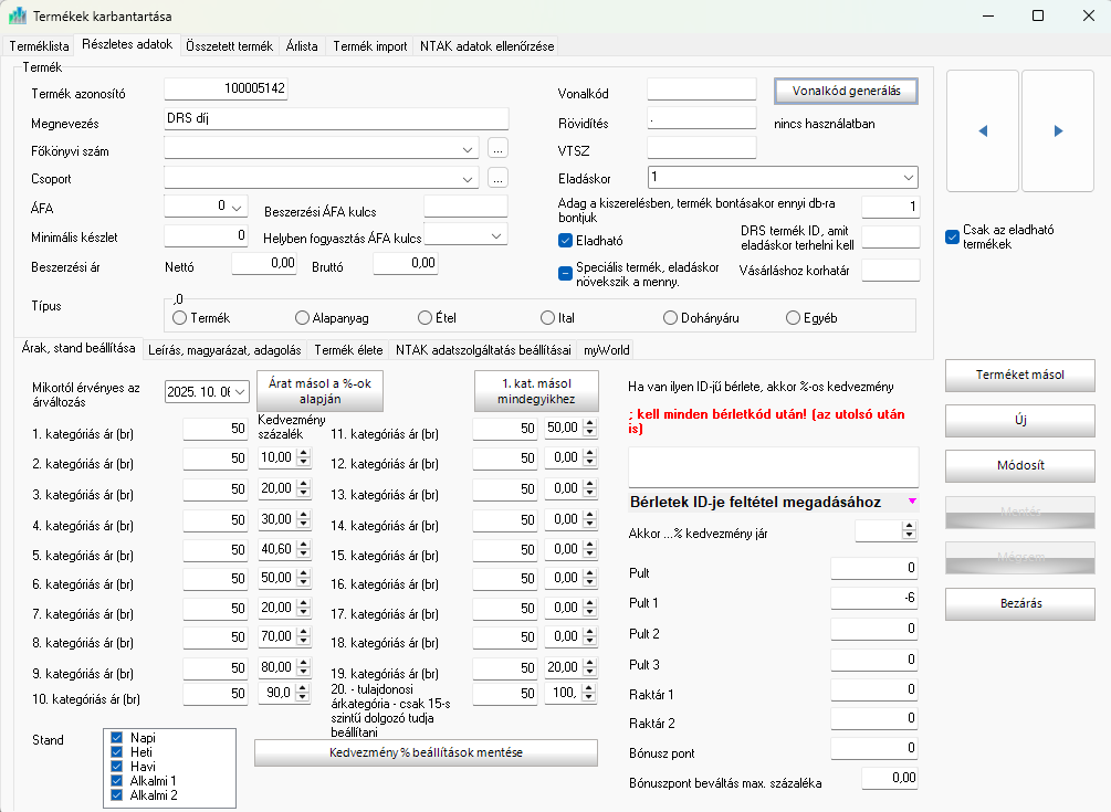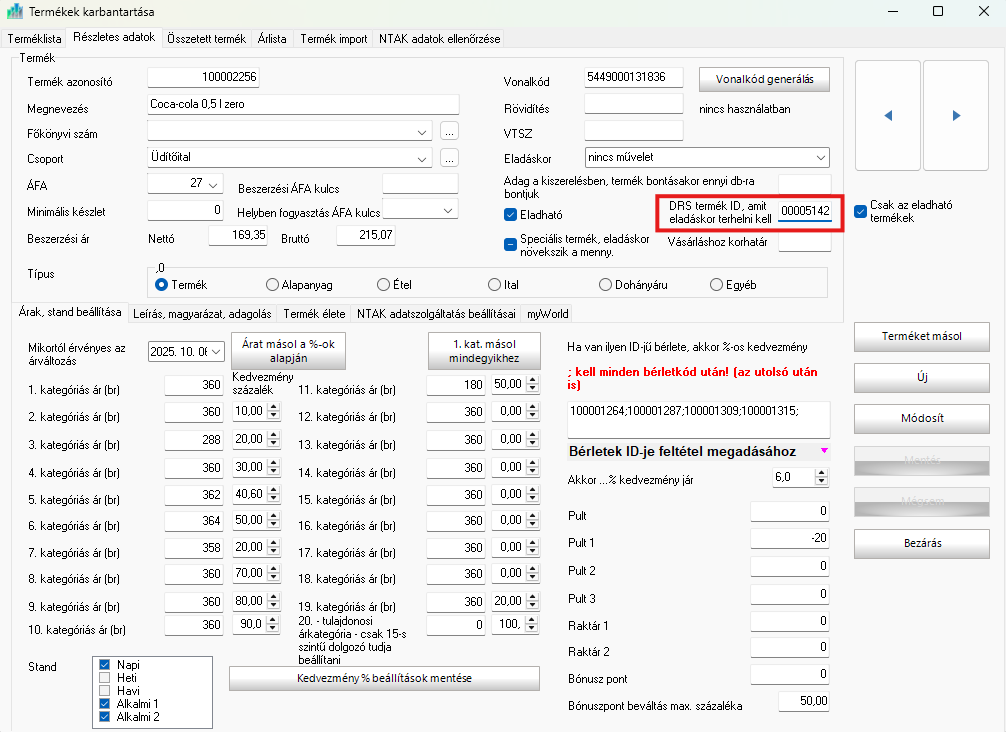 A DRS (visszaváltható csomagolás díja) beállítása, hogy az érintett italtermékek eladásakor automatikusan hozzáadódjon az 50 Ft-os DRS díj.